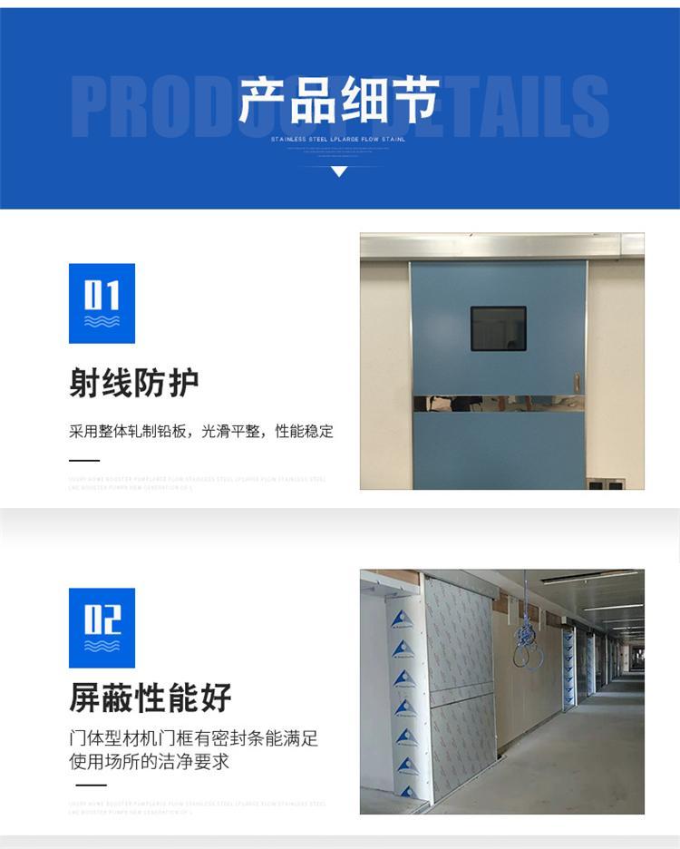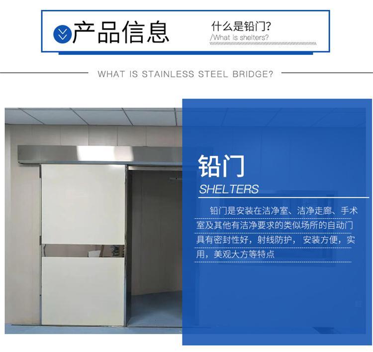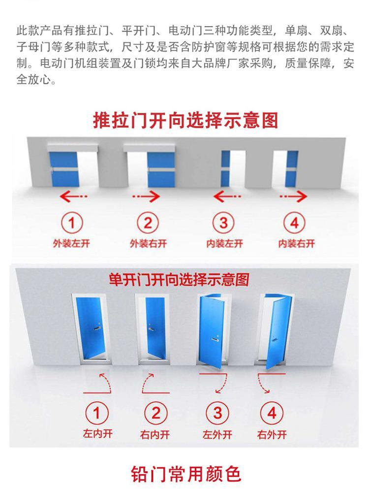 推拉防射线门,开启方向是沿着墙壁平行挪动,门体的构造与资料是依据放射线机的功率大小(KV)及门洞口大小来决议的,门框构造与平开门构造有所区别,电动防射线门电动防射线门普通合适较大的门体。
